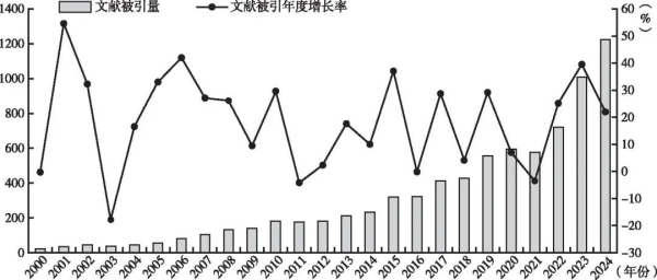通过对本领域2000—2024年间年度文献增长数量的基本判断,结合文献年度被引数量及增长趋势(见图1),研究结果表明,本领域研究的传播广度与关注度表现出较为显著的阶段性演进特征,其主要阶段划分及成因表现为如下方面。